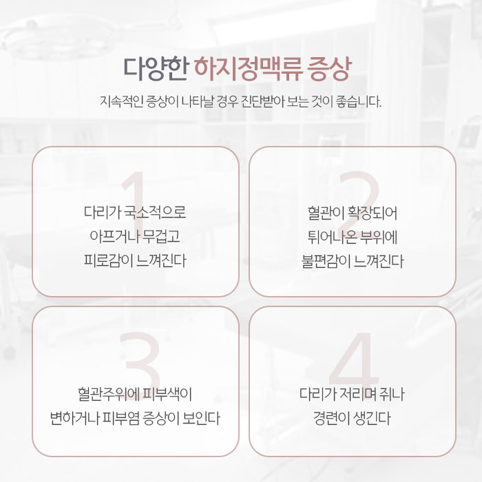 무엇보다 하지정맥류는 혈액순환 장애로 발생하는 만큼 치료가 늦어지면 이후 일상과 건강에 많은 영향을 미칠 수 있습니다. 그래서 초기에 증상이 의심된다면 적극적으로 치료하고 관리하는 것이 중요합니다.