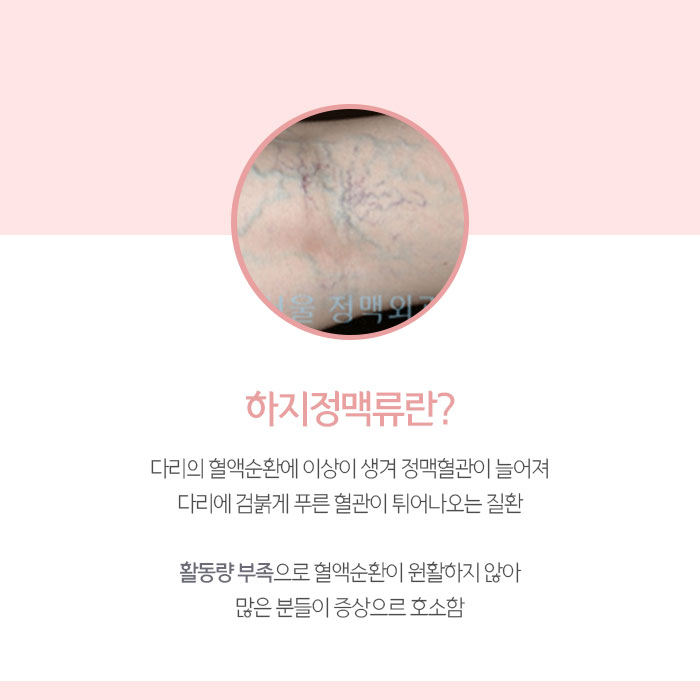 오래 걷거나 무리한 날에는 다리가 붓고 저릴 수 있습니다. 그러나 반복적으로 다리가 저리고 붓기가 심하며 통증이 느껴지거나 혈관이 도드라져 보인다면 하지정맥류를 의심해보고 검사받아봐야 합니다. 심장에서 온몸으로 산소와 영양분들 공급한 혈액이 하체에서 심장으로 되돌아가야 하는데 정맥 내 판막기능 저하로 역류하면서 하체에 고여 정맥이 확장되는 질환을 하지정맥류라고 합니다.