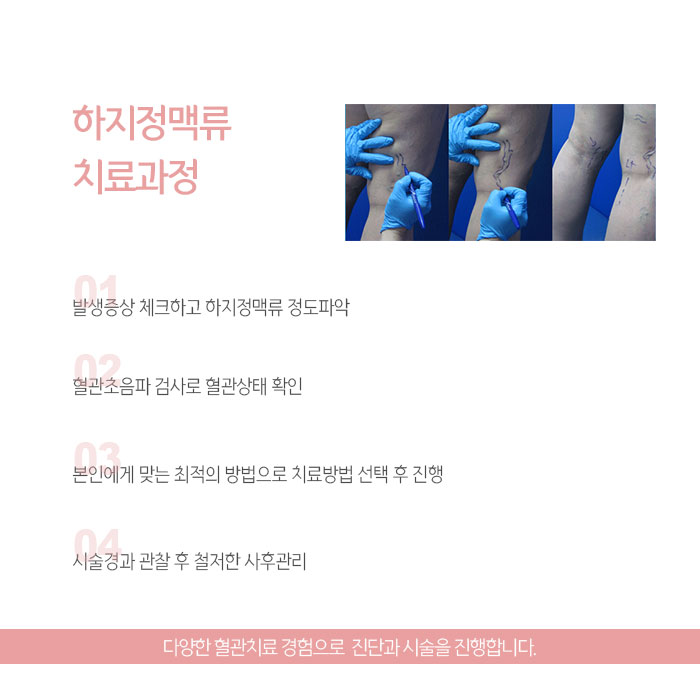 그리고 비수술적인 방법 중 혈관경화요법은 확장된 혈관을 단단하게 굳히는 경화제라는 약물을 주사로 주입하는 방법입니다. 증상이 심하지 않거나 무릎 아래에 증상이 있을 때 주로 시행하며, 정도에 따라 여러 번 반복하기도 합니다. 그러나 치료시기를 놓쳐 상태가 악화됐다면 고주파, 레이저, 베나실, 보행정맥절제술 등 수술적인 치료가 고려됩니다.